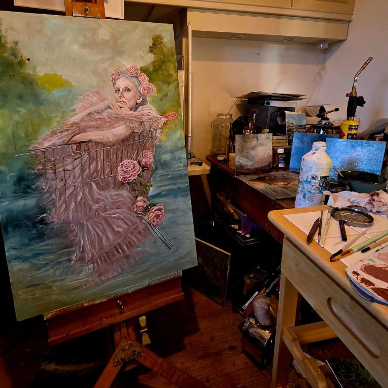Catherine explains, "The oil and wax technique helps me to get involved with the painting much like glass does, the image emerges in an emotional spontaneous yet controlled manner. Using considered mark making. One mark of paint, crayon or sgraffito can express so much."